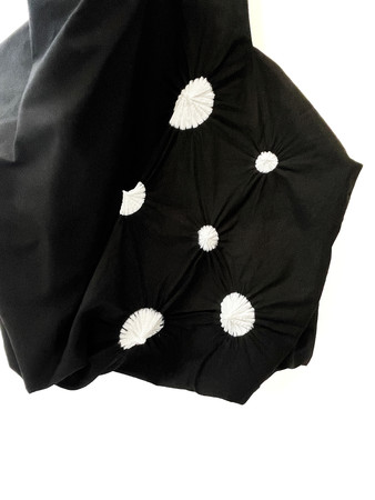 伝統工芸「名古屋黒紋付染」の絞り技術で水玉模様が表現された「Unevenness tote dots」。摘まみ上げられた凸凹が印象的で、柔らかな「Unevennss」は、内装の袋を少し底上げすることで、モノを入れてもバッグのドレープが美しく再現され崩れない設計。ユニークな造形と手仕事の厚みが、オーガニックコットンが染められたヘルシーなバッグにスタイルを加えます。