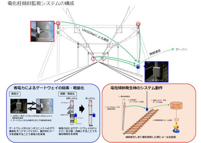 JR東日本では、鉄道の架線を張り替える工事を行う際に、工事の信頼性確保のため架線を支える電化柱の傾斜監視を必要により行っています。従来のシステムは、機器の運搬・設置に多くの労力を費やしており、終電後の深夜帯に作業を行う作業従事者にとって大きな負担となっていました。