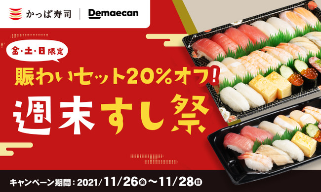 コロワイドグループのかっぱ寿司(カッパ・クリエイト(株) 本社:神奈川県横浜市)は、出前サービス「出前館」(運営:株式会社出前館)が開催する「週末すし祭」キャンペーン【開催期間2021年11月26日(金)~11月28日(日)】に参加いたします。