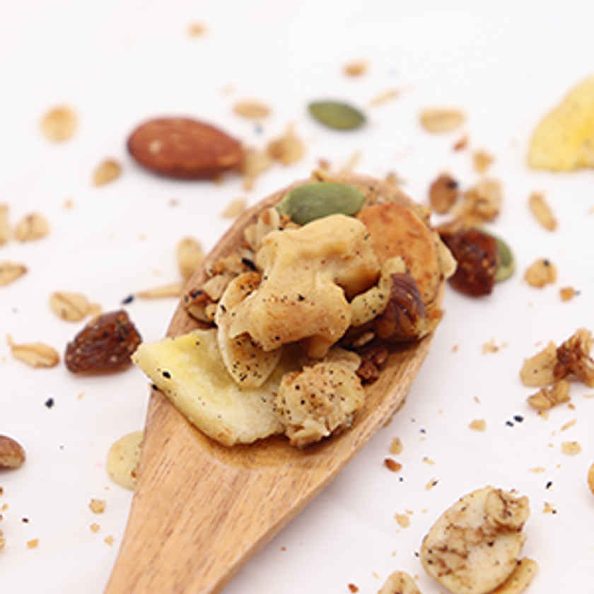 シナモンとオレンジが香るアッサム茶を抽出したシロップが入っており、牛乳をかければ「食べるチャイラテ」に!紅茶好きにはたまらない、2度おいしいグラノーラです。