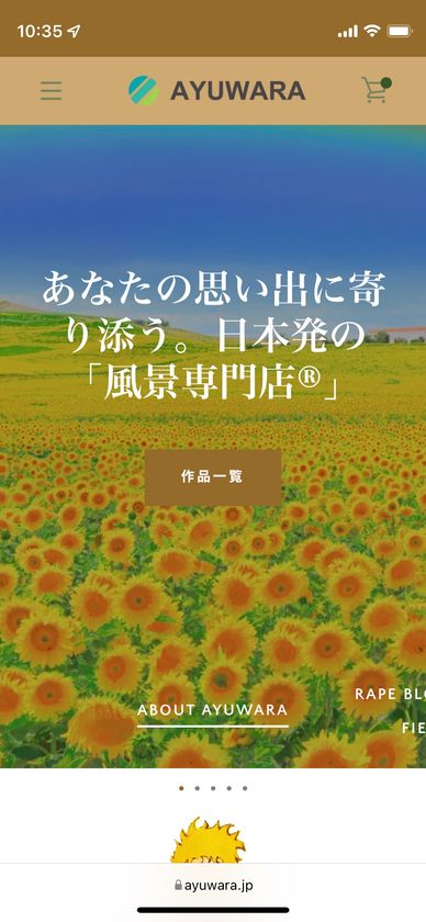 日本発、景色・心の風景・情景を提案する専門店「風景専門店(R)」を運営。絵画・壁掛けの企画・制作・販売が主力。絵画・壁掛けの商品数は10,000点、販売実績は130,000枚以上。絵画・壁掛け販売としてはネットショップとして日本最大級の規模を誇ります。「あゆわら」の由来は、「愛友和楽」の頭の一文字ずつから取りました。「愛情、友だち、人の和・和やか、楽しい」を大切にし、広めることで社会に貢献することを事業目的としています。