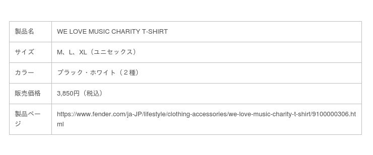 プロジェクトの一環として11月に発売されたチャリティソング『We Love Music』の制作に参加した日本を代表する15名のギタリスト・ベーシストのサインやプロジェクトロゴがプリントされたチャリティTシャツを12月7日(火)よりフェンダー公式オンラインショップにて販売します。シャリティTシャツの販売で得た収益は、チャリティとして学校に寄付されます。(購入はこちらから:https://www.fender.com/ja-JP/lifestyle/clothing-accessories/we-love-music-charity-t-shirt/9100000306.html)