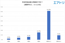 年末年始の連休について就業中の人に聞いたところ、「6連休以上」と回答した人が61.8%と最も多く、続いて「5連休(15.7%)」という結果になり、約8割の人が5連休以上を予定しているとなった一方で、年末年始に「連休はない」人が9.6%いました。