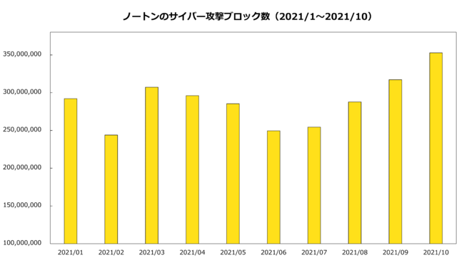 ノートンでは、世界全体で、1ヶ月に平均約3億件以上のサイバー攻撃をブロックしました(2021年1月~10月)。特に2021年10月は3億5,000件を突破し、前年同月比151%の脅威が確認されました(2020年10月:198,786,313件)。