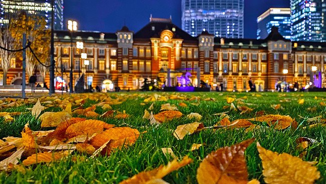東京駅をテーマにする場合、ついついフォーカスをあててしまいがちな「駅舎」をあえてぼかし、手元の芝と落ち葉に焦点を合わせた“アレンジの妙”にセンスを感じました。季節感の演出の仕方も見事。