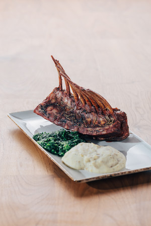 Menu : ラム(1ラック2名様用),ほうれん草のクリーム炒め,マッシュポテト,クラムチャウダー,サラダ,パン