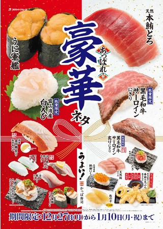 この一年、更なる“うまい!”を追求したかっぱ寿司が感謝の気持ちを込めてお贈りする、今年の締めくくり&新しい年をお祝いするにふさわしい「あっぱれ!豪華ネタ」フェア。この時期ならではの、ちょっと贅沢なうにや本鮪、黒毛和牛に白えびといった豪華ネタが満載です。