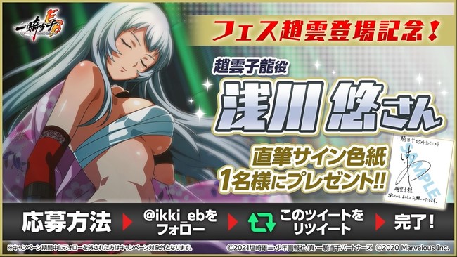 今回のバーストフェスで登場した「趙雲子龍」の声を演じられている浅川悠さんの直筆サイン色紙が抽選で当たる!詳細は公式ツイッターをご確認下さい。