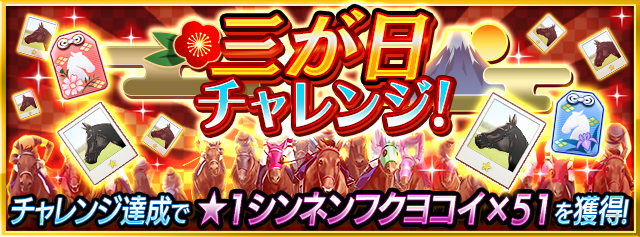 2022年1月1日(土)0:00から 2022年1月3(月)23:59までの期間内に、様々なチャレンジをクリアすると、達成内容に応じて★1種牡馬「シンネンフクヨコイ」、「杜若色のお守り」、「秋桜色のお守り」を獲得できます。