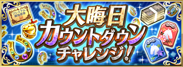 2021年12月26日(日)0:00から2021年12月31日(金)23:59までの期間内に、様々なチャレンジをクリアすると、達成内容に応じて「プレミアム種抽選券」、「金の馬蹄石」、「杜若色のお守り」、「秋桜色のお守り」、「受胎祈願の鈴」、「資金」を獲得できます。