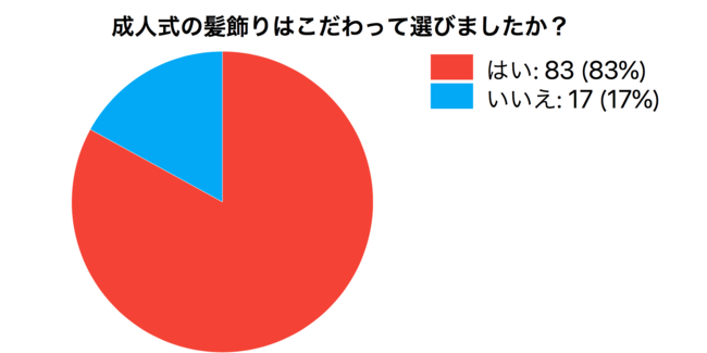 「Q1.成人式の髪飾りはこだわって選びましたか?」と質問したところ、「はい」が83%、「いいえ」が17%という結果になりました。