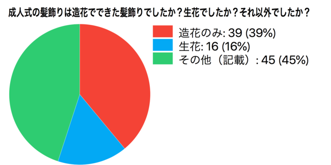 「Q2.成人式の髪飾りは造花でできた髪飾りでしたか?生花でしたか?それ以外でしたか?」と質問したところ、「造花のみ」が39%、「生花」が16%「その他(記載)」が45%という結果になりました。