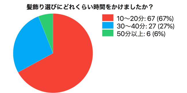 「Q3.髪飾り選びにどれくらい時間をかけましたか?」と質問したところ、「10~20分」が67%、「30分~40分」が27%「50分以上」が6%という結果になりました。