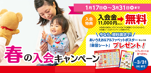1月17日(月)~3月31日(木)まで、入会特典として入会金11,000円が無料になる「春の入会キャンペーン」を実施いたします。