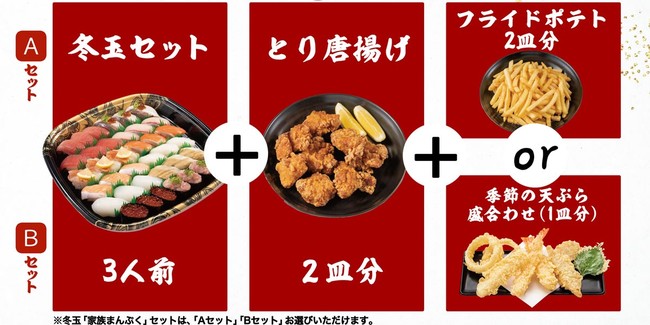 『冬玉「家族まんぷく」セット』は3人前の「冬玉セット」に『とり唐揚げ(2皿分)』、さらにお好みに合わせて『フライドポテト(2皿分)』または『季節の天ぷら盛り合わせ(1皿分)』をお選びいただけます。そして『冬玉「超まんぷく」セット』は『冬玉「家族まんぷく」セット』に、さらに食卓でお好みの具材を巻いて“自分だけの手巻き寿司”が楽しめる「手巻き寿司セット(3人前相当)」がついてくるという、その名のとおり超まんぷくになること間違いなし!のボリューム満点のセットです。