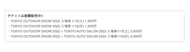 世界最大級のカスタムカーイベントとして知られている「TOKYO AUTO SALON 2022」と併催される「TOKYO OUTDOOR SHOW」 。 同じ幕張メッセが会場の東京オートサロンに入場できるチケットも用意されているので、その共通チケットであれば、アウトドアだけでなくクルマも、たっぷりと満喫できる1日に!!