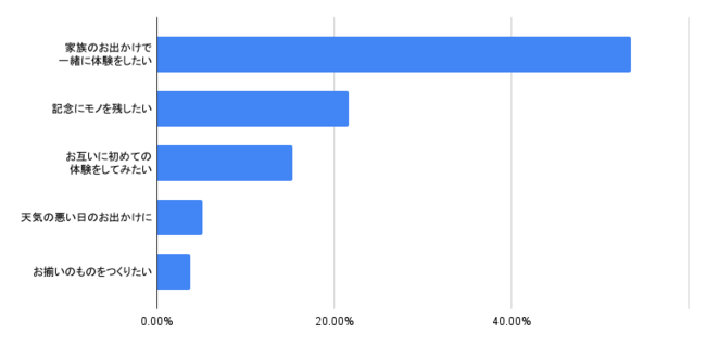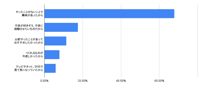 の順で多い結果となっています。ものづくり体験同様、「子供と初めての体験を一緒にしたい」という視点が一番多かったほか、「以前やったことがあり、今度は子供と一緒に体験したい」という声も多く集まっています。