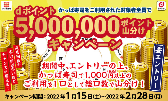 ・内容:期間中にエントリーの上、「かっぱ寿司」でdポイントカードをご利用いただくと1,000円(税込)以上(5ポイント以上ためる) を1口とし、総口数でdポイント500万ポイントを山分け進呈いたします。
