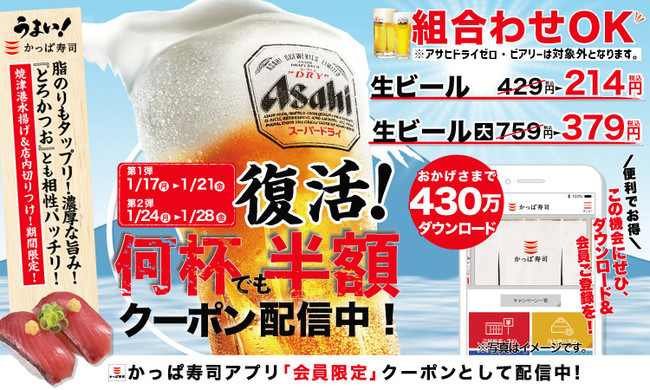 コロワイドグループのかっぱ寿司(カッパ・クリエイト(株) 本社:神奈川県横浜市)は、第1弾2022年1月17日(月)~1月21日(金)、第2弾2022年1月24日(月)~1月28日(金)の期間、かっぱ寿司で使用できる「生ビール半額クーポン」をかっぱ寿司アプリ会員に配信いたします。