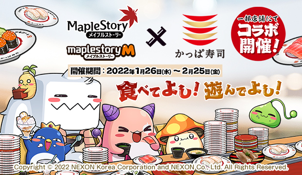 メイプルストーリー&メイプルストーリーM×かっぱ寿司 コラボ商品販売やゲーム内アイテム配布含む食べて遊べる!豪華コラボキャンペーン開催!