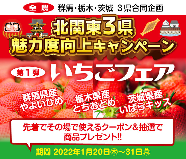 北関東3県魅力度向上キャンペーン」は、群馬県・茨城県・栃木県の北関東3県のショップ(新鮮ぐんまみのり館、いいものいっぱい広場、とちぎ新鮮倉庫)が連携し、食を通して産地の魅力を発信していくキャンペーンです。期間中は、対象3県のいちごがその場で使える300円引きのクーポンを各50名様(合計150名様)にプレゼントします。また、期間中に対象商品をご購入いただいた方の中から、各県から抽選で1名様、合計3名様に1万円相当の「北関東3県の商品詰め合わせセット」が当たります。