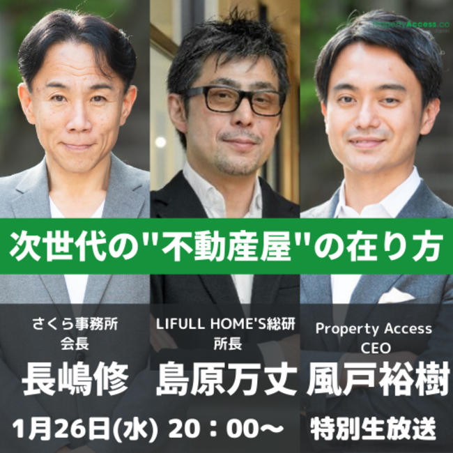 不動産コンサルタントでさくら事務所・らくだ不動産会長の長嶋修氏、LIFULL HOME'S 総研所長島原万丈氏、Property Access株式会社代表取締役・らくだ不動産取締役の風戸裕樹の3名による特別対談。不動産業界をこよなく愛する三人が、今、不動産業界で仕事をしている人にもっと好きになってもらうように、そして、不動産業界に興味を持っている人に不動産業界を選択してもらえるように。厳しい現実を交えながらも、不動産業界の未来についてディスカッションします。