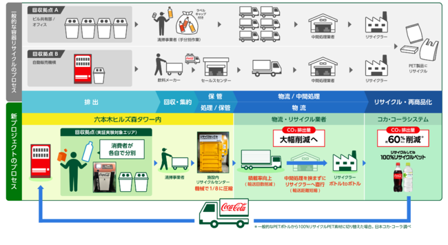 本実証実験は、六本木ヒルズ 森タワー内の実証実験対象エリアで発生した使用済みPETボトルを、専用の自動回収機(RVM)と既設の分別回収ボックスで回収し、飲料用PETボトル容器として再生させる「ボトル to ボトル」リサイクルの具現化を目指し、排出事業者と飲料メーカー、リサイクラーの協働による新たなシステムの構築および運用に挑戦します。通常、使用済みPETボトルの回収からリサイクルまでは複数の業者・ルートを経由しますが、本実証実験では森タワー内で回収・圧縮まで行い、圧縮したPETボトルを直接「ボトルtoボトル」のリサイクルを行うリサイクラーに輸送することで、輸送効率を高めながら確実にリサイクル用の資源として提供します。本実証実験で回収されたPETボトルは、「ボトルtoボトル」により、再びコカ・コーラ社製品のPETボトルへとリサイクルされる予定です。新たな循環モデルが確立されることで、PETボトルの輸送・処理によって発生していたコストと温室効果ガス排出の抑制につながることに加え、日本のPETボトル回収率(96.7%。2020年度。「PETボトルリサイクル年次報告書2021」より)のさらなる向上と、「ボトルtoボトル」によるリサイクルの普及が期待されます。