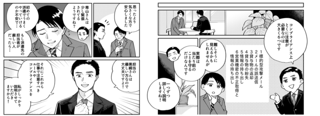 同社では、全従業員のコンプライアンス意識を向上させるべく啓蒙活動を行っております。従来、パワーポイントの資料を基にスライドショーにて資料を作成していましたが、従業員からは、文字が多く読みづらい、視覚的にわかりづらいなどの声があり、他のコンテンツを模索されておりました。「コミックラーニング」を活用することで、コミックの持つ親近感、没入感から生まれる当事者意識の高まり及び学習理解度の向上が期待されます。