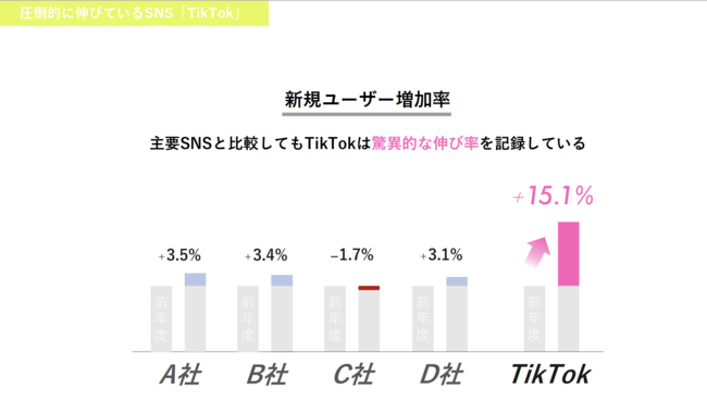 EmpaCでは、採用現場の悩みを解決すべく、企業が採用する人材の年齢層の多くが利用している、TikToに着目しました。TikTokはSNSの中でも新規ユーザー増加率が群を抜いており、採用の潜在層となる10代の58%も利用している、今急成長中のプラットフォームです。