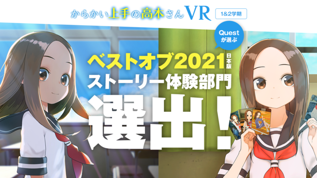 「ベストオブ2021年 日本版」では、2021年に素晴らしかったVR作品を大人気ゲームから革新的なビジネスアプリまで15のカテゴリでそれぞれ選出しています。「からかい上手の高木さんVR 1&2学期」は、ストーリー体験部門で「ALTDEUS: Beyond Chronos (アルトデウス: ビヨンドクロノス)」、「Star Wars: Tales from the Galaxy's Edge」と並び選出されました。