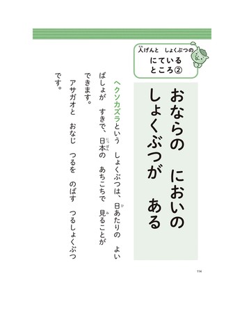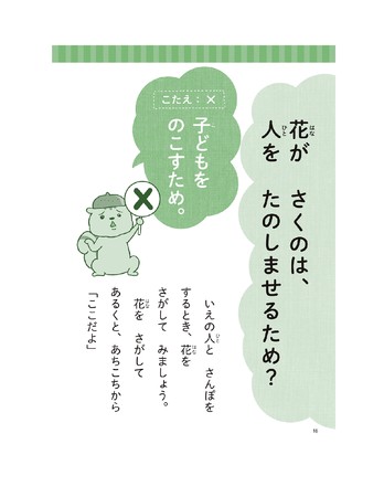 ファーストステップは、花と草に関する◯×クイズ。親子や子ども同士で出し合って楽しめます。小学校3年生から始まる「理科」の知識も含まれているので、新しい教科にスムーズに進めます。