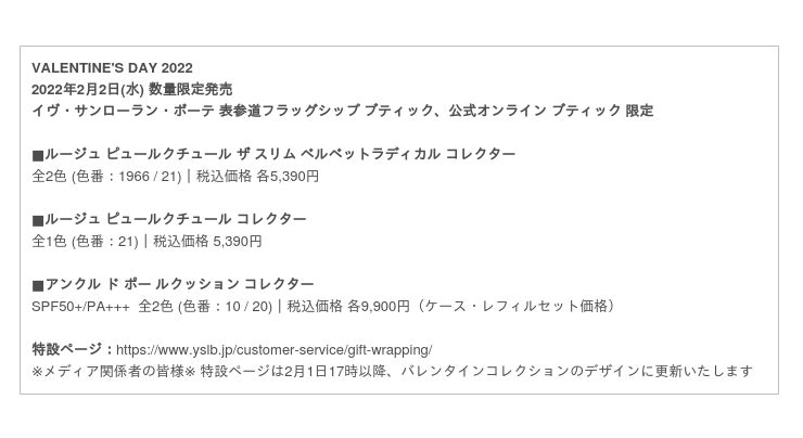 VALENTINES' DAY 2022|2022年2月2日(水) より、イヴ・サンローラン・ボーテ 表参道フラッグシップ ブティック、公式オンライン ブティックにて数量限定発売