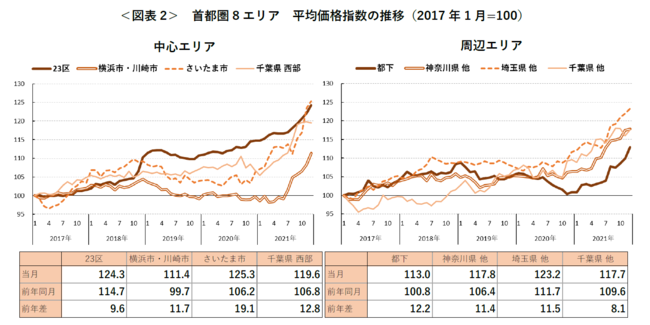 なお、東京都(23区/都下)、神奈川県(横浜市・川崎市/他)、埼玉県(さいたま市/他)の6エリアが2017年1月以降最高額を更新した。