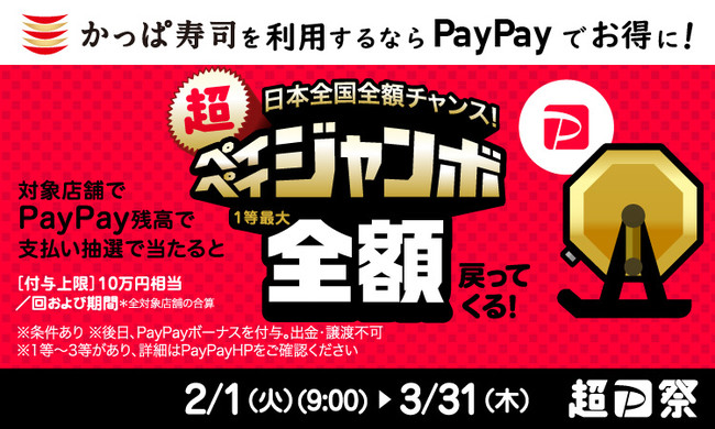 コロワイドグループのかっぱ寿司(カッパ・クリエイト(株) 本社:神奈川県横浜市)は、2022年2月1日(火)~3月31日(木)の期間、PayPay株式会社(本社:東京都港区)主催の「日本全国全額チャンス!超ペイペイジャンボ」キャンペーンに参加します。