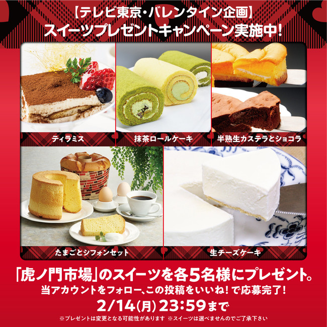 また、テレビ東京宣伝部の公式インスタグラム(@tvtokyo_PR)をフォローし、該当する投稿を「いいね!」してくれた方に抽選で25名様に、テレビ東京のお取り寄せグルメ通販サイト「虎ノ門市場」から、この時期ぴったりの甘~いスイーツをプレゼント。テレビ東京の人気ドラマや公式SNSを楽しく見ながら、バレンタインキャンペーンに参加しませんか!?ふるってご応募ください。