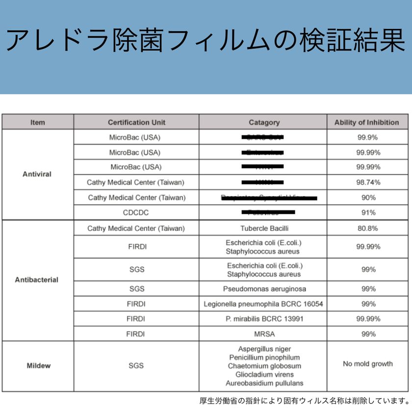 アレドラ除菌フィルムに付着したウィルスを20分以内に90%以上を除去します。