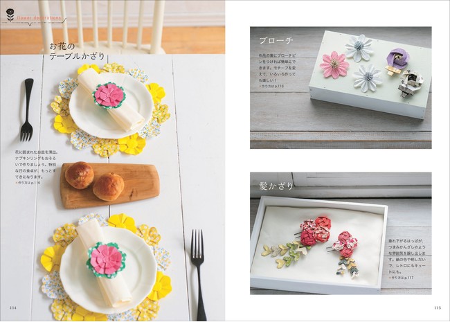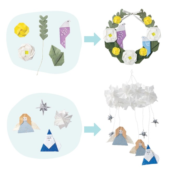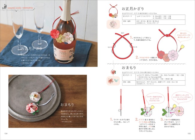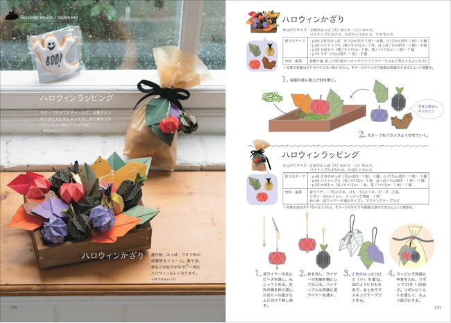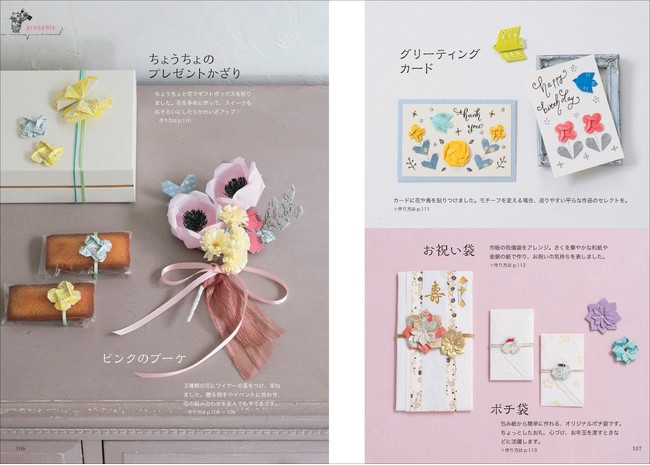 折った作品を使って、室内やテーブルを飾るもの、ちょこっとアクセサリー、季節のイベントを盛り上げる雑貨などのアイデア&作り方も掲載。カードやプレゼント飾り、ブーケなどに使えば、ギフトにもぴったり!