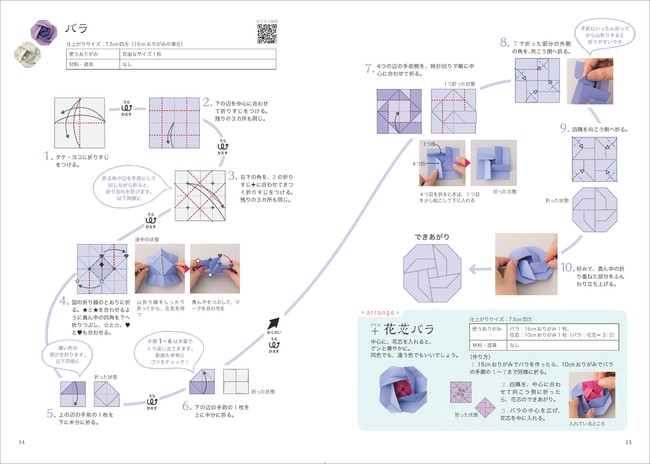 折り図にはきめこまかなアドバイスつき。ポイント箇所には写真での解説もあり、するすると折れます。