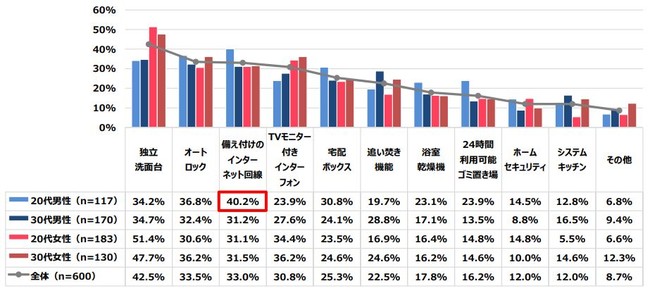 次に、引越しの際に重視した設備をお聞きしました。全体で最も多い回答が「独立洗面台」で42.5%という結果となりました。次いで「オートロック」33.5%、「備え付けのインターネット回線」33.0%の順となっています。性年代別で見ると、20代男性のみ「備え付けのインターネット回線」が最も多い回答となりました。前問【Q1】の結果から、20代男性は引越し先の物件に“インターネット回線が備え付けられているか”にも重きを置いているようです。