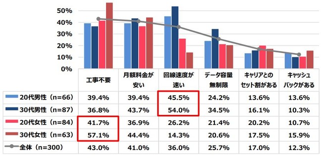 20代・30代男性は「回線速度が速い」が最多回答。20代・30代女性は「工事不要」が最多という結果に。