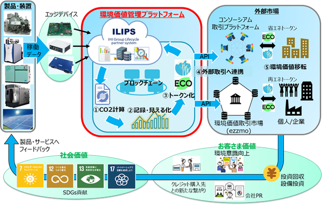 IHIでは,IHIグループのお客さまの装置や設備の稼働データをクラウドサーバに集積し,モニタリング,データ分析,データ利活用により故障予兆検出や稼働率向上を図るIoT基盤ILIPS(IHI group Lifecyle Partner System)をサービス展開しています。このたび,ILIPS上に,各データから算出したCO2排出/削減量をブロックチェーン技術※1により記録・見える化し,環境価値に変換して外部市場に流通させる仕組み「環境価値管理プラットフォーム」を構築し,実装を開始しました。