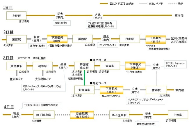 「大自然の織りなす風景と、受け継がれてきた悠久の文化にふれる旅。」として、上野を出発して日本海側を北上し、北海道の函館・道南を巡ります。雄大な景色や海の幸、アイヌ文化などの歴史に触れていただきます。その後本州に戻り、2021年に世界文化遺産に登録された三内丸山遺跡を訪問するコースや黒石市で「世界に一つだけのうちわ」制作を体験するコースで、東北の文化に触れていただく内容となっています。