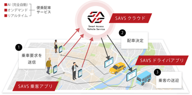 株式会社未来シェアのオンデマンド・リアルタイム配車サービスSAVS(Smart Access Vehicle Service)を利用し、タクシー(デマンド交通)と路線バス(乗合い交通)の長所を融合した、時間・ルートを固定せず乗合い車両の配車決定を行うサービス。スマートデバイス(IoT)とクラウドプラットフォームをベースとしたアプリケーションが通信し、人口知能(AI)がリアルタイムに全車両の走行ルートを決定。需要に即した乗合い車両の最適な配車決定を完全自動(無人)で行うことが可能になります。