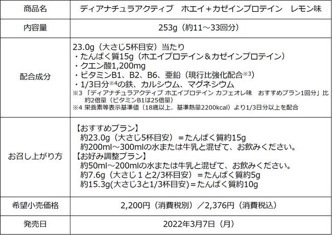 アサヒグループ食品株式会社(本社 東京、社長 川原浩)は、運動ニーズが高まる中、運動後もアクティブでありたい方をサポートする『ディアナチュラアクティブ ホエイ+カゼインプロテイン レモン味』を3月7日より全国で新発売します。