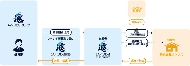 このファンドは営業者であるSAMURAI ASSET FINANCE株式会社(以下、「営業者」)が実施した、株式会社リンクス(以下、「貸付先」)への貸付事業から生ずる収益を出資者に分配するものです。本匿名組合では営業者が貸付先に対して実行した3億5,000万円の貸付(以下、「本件貸付」)に対するバックファイナンスをおこないます。