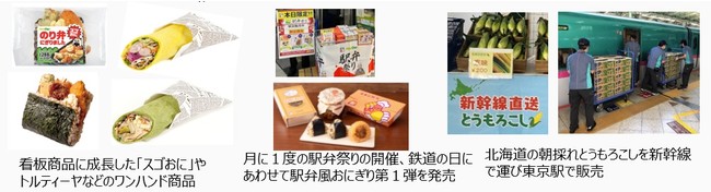「スゴおに」「トルティーヤ」などのワンハンド商品にさらに磨きをかけるとともに、JR東日本グループの強みを生かした「駅弁」などの展開、鉄道ネットワークや長年培ってきた地域とのつながりを活かし地域特産品を徹底的に掘り起して列車に乗せて「東京のものを地方で」「地方のものを東京で」販売するなど、駅をご利用になるお客さまの日常に彩りを添えていきます。