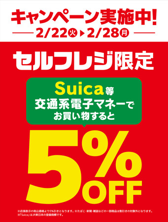 2. 実施内容 セルフレジでSuica等の交通系ICカードでお買い物をすると、お会計合計金額より5%割引き