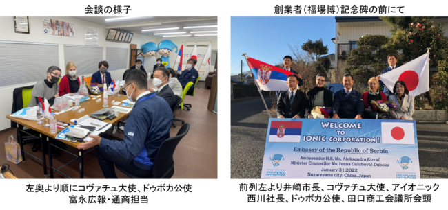 アイオニック株式会社(千葉県流山市、代表取締役:西川満、以下「アイオニック」)は、2022年1月31日(月)にセルビア共和国大使館より、アレクサンドラ・コヴァチュ特命全権大使、イヴァナ・ドゥボカ公使参事官、広報・通商担当富永正明様のご来訪を歓迎致しました。