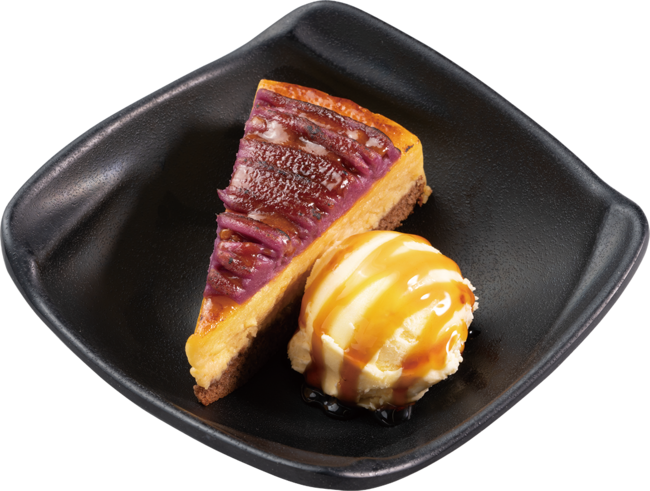 2種類の九州産のさつま芋を使用した『九州産紅はるかとアヤムラサキの焦がしスイートポテトケーキ』。糖度が高くしっとりとした食感が特長の「紅はるか」はスイートポテト生地に、鮮やかな紫色が美しい「アヤムラサキ」はクリームに仕立てています。仕上げにはキャラメルキャンディーをトッピングし、直火で炙り香ばしさもプラス。バニラアイスと共にお楽しみください。