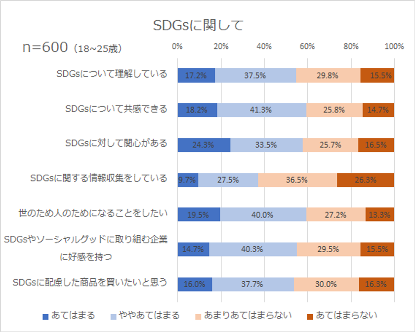 全国の18歳~25歳の男女600人に「SDGs」に関して複数の質問をしたところ、「SDGsについて理解している」については、「あてはまる」「ややあてはまる」が54.7%、「SDGsについて共感できる」59.5%、「SDGsについて関心がある」57.8%と6割近い結果に。